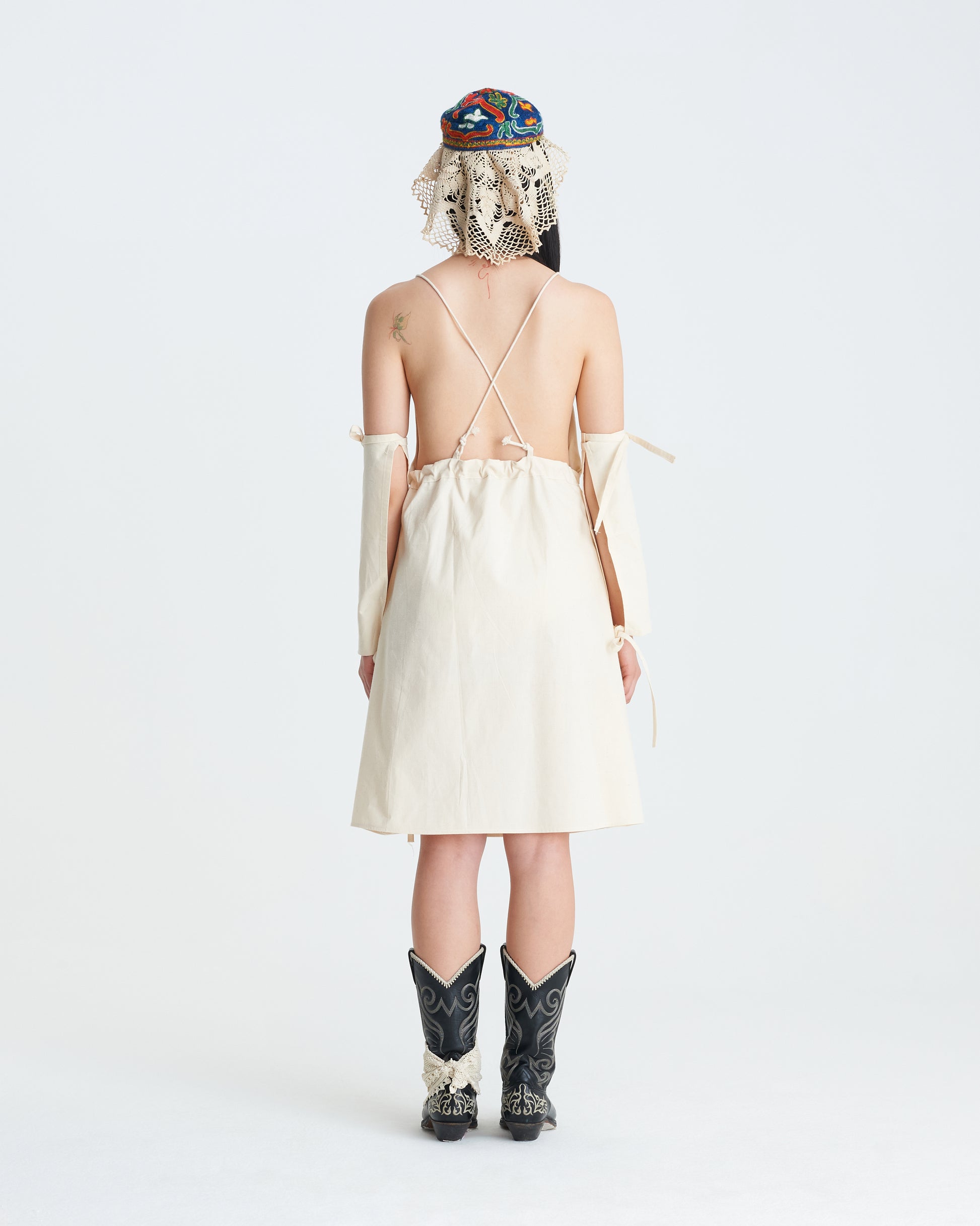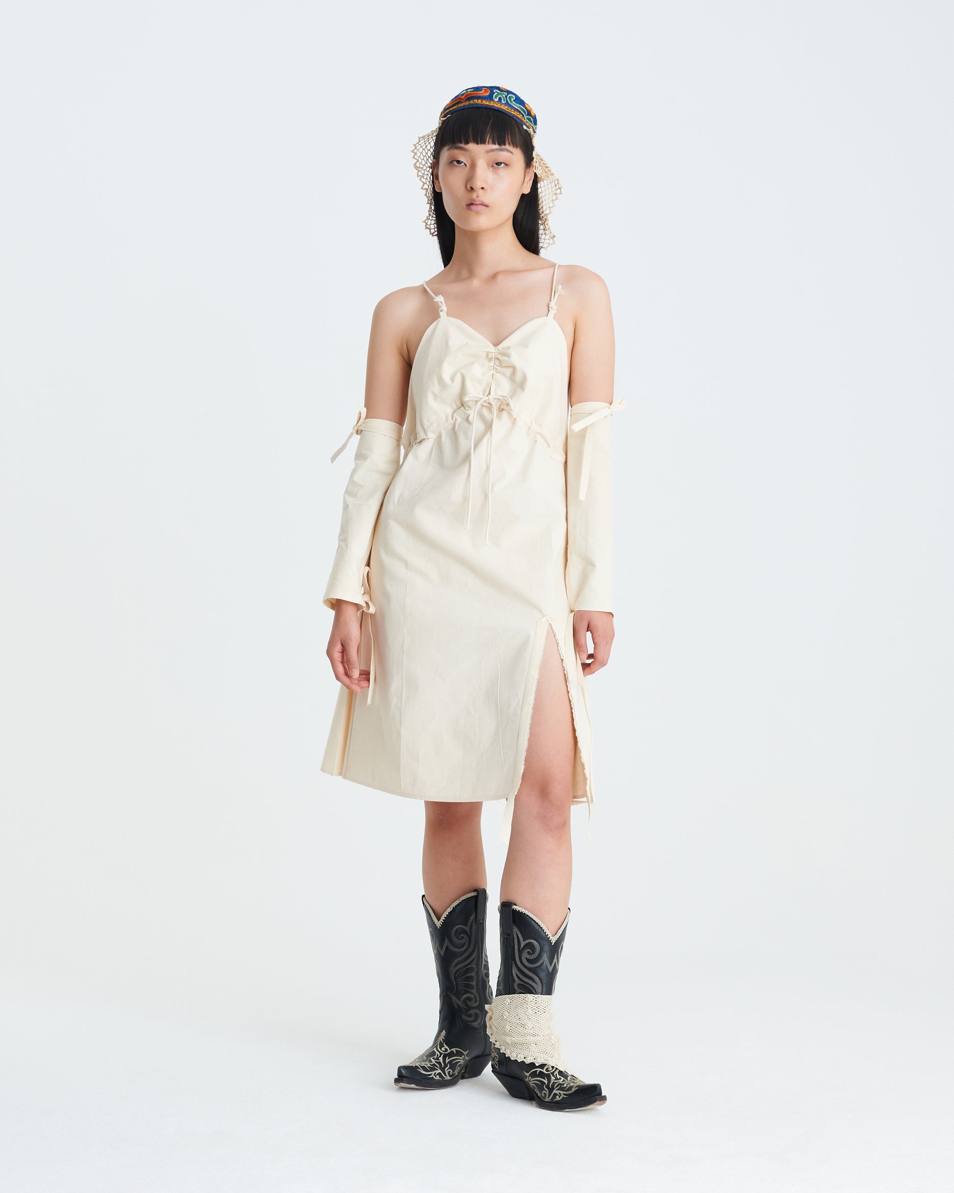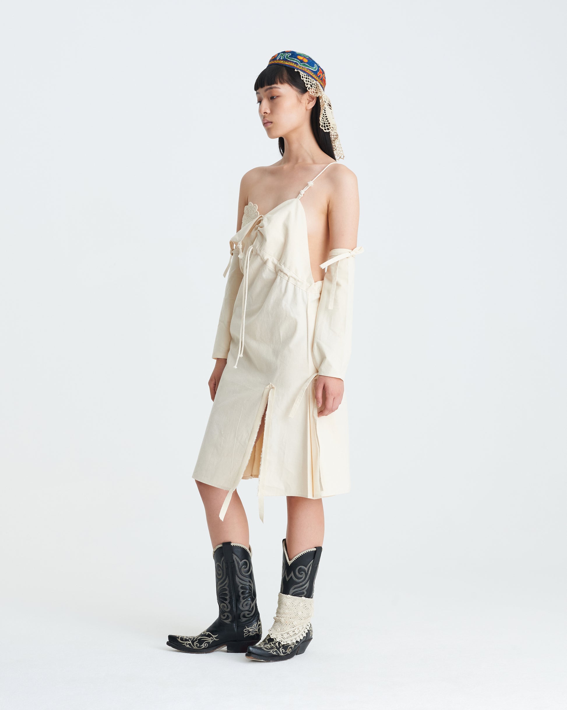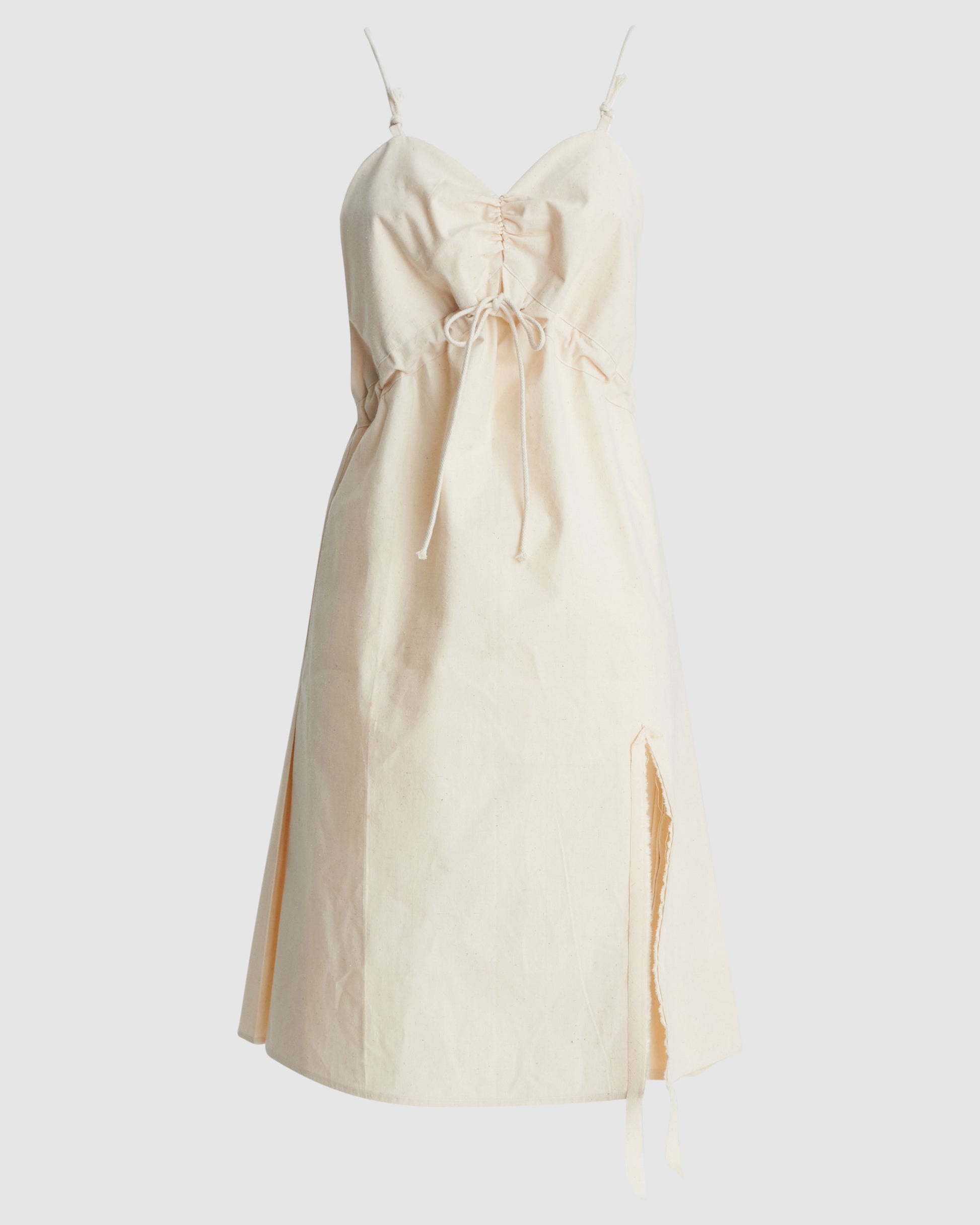 Petticoat with V-neck, pleated front, adjustable straps, side slit.
