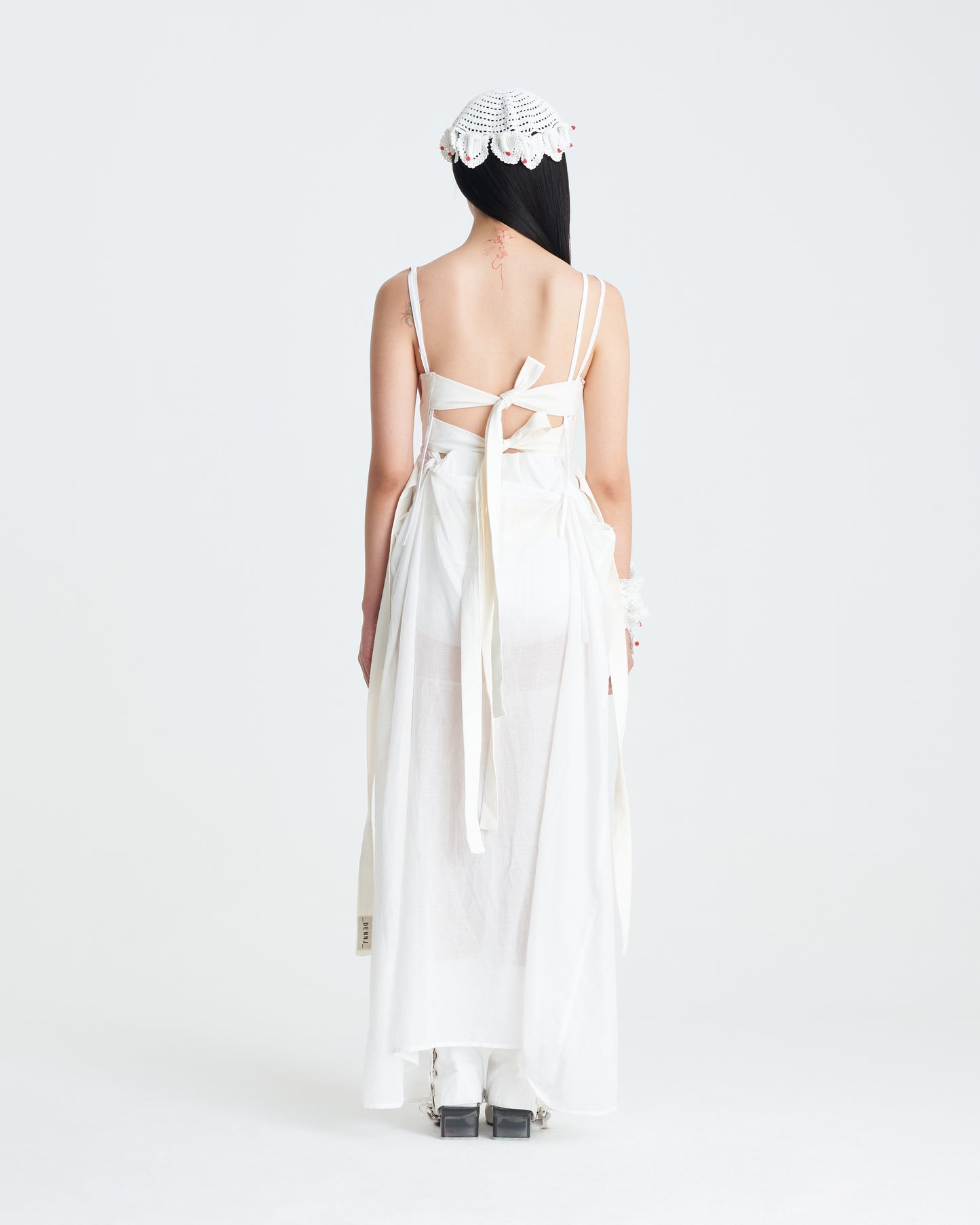 Inspired by the 1780 French corset. No splints, the latching is guaranteed by 3 long ribbons on the sides. Second-hand or vintage fabrics, assembled and cut one by one, sewn with a linear machine, finished with similar trimming by hand. Adjustable shoulder straps.