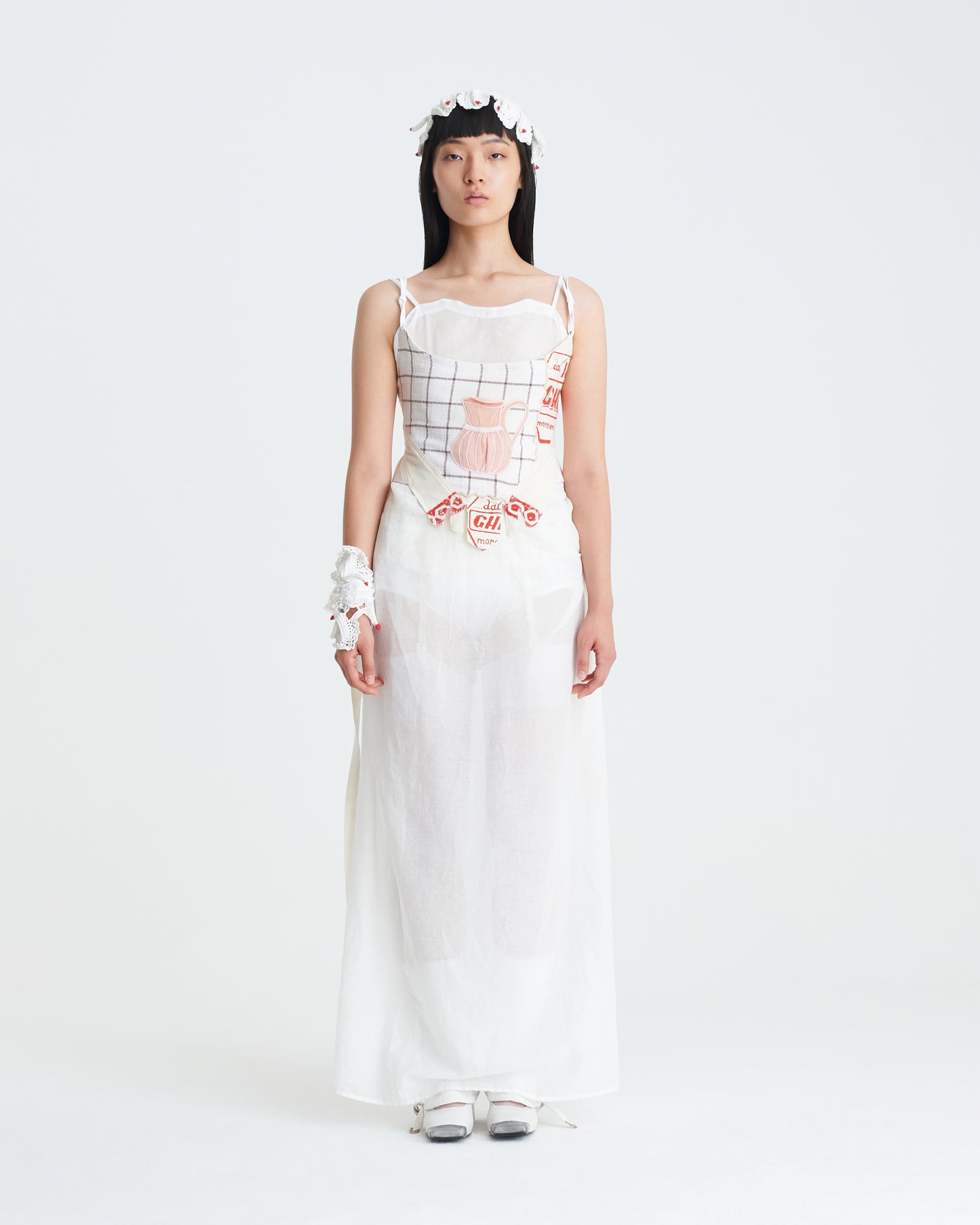 Inspired by the 1780 French corset. No splints, the latching is guaranteed by 3 long ribbons on the sides. Second-hand or vintage fabrics, assembled and cut one by one, sewn with a linear machine, finished with similar trimming by hand. Adjustable shoulder straps.